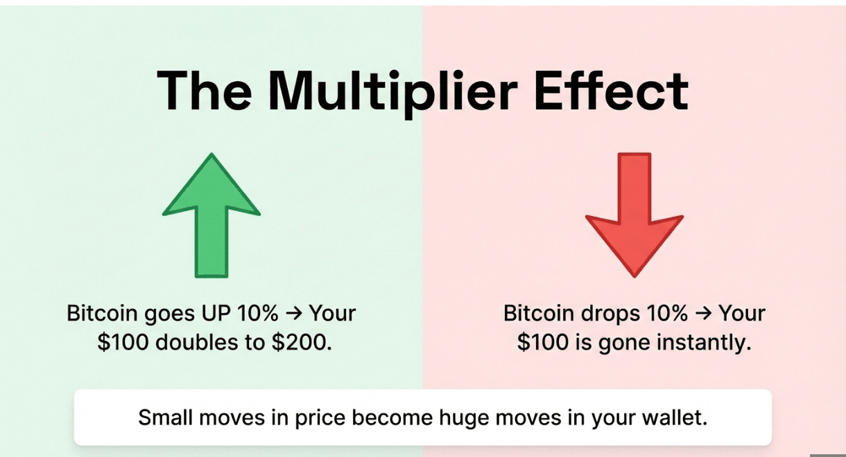 Dacă Bitcoin crește cu 10%, cei $100 ai tăi se dublează la $200.