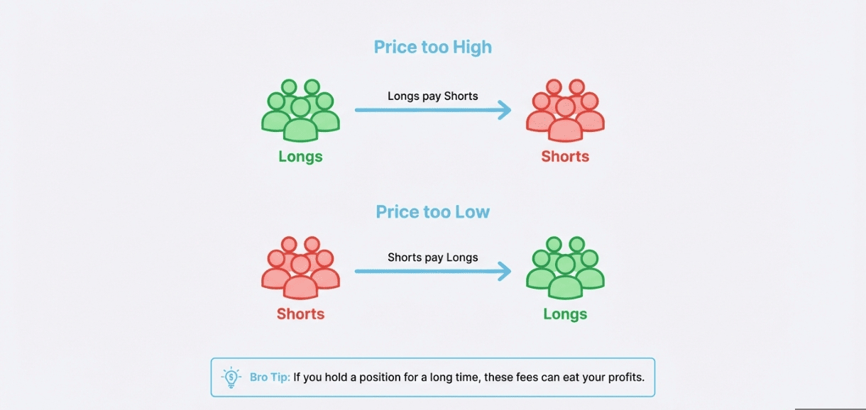 Dacă Prețul Perp este MAI MARE decât Prețul Real: Piața este prea optimistă. Long-urile (persoanele care pariază în sus) trebuie să plătească o taxă în numerar Shorts-urilor (persoanele care pariază în jos).