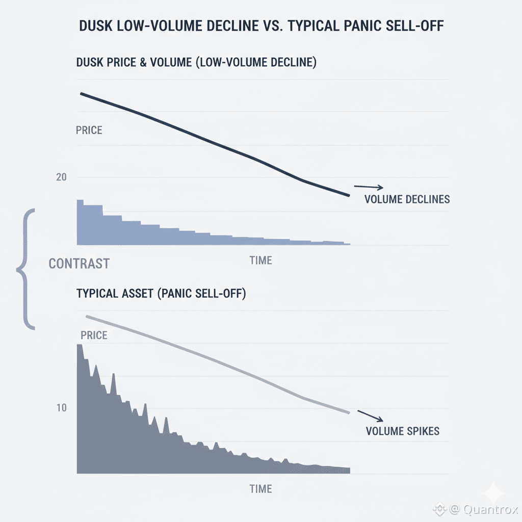 What I keep coming back to is how different this volume pattern is from typical altcoins during selloffs. Most tokens see volume surge as fear spreads. Dusk sees volume decline as price drops. That's either the earliest signal of a genuinely different holder base, or it's an anomaly that will revert to normal panic selling if price drops much further.