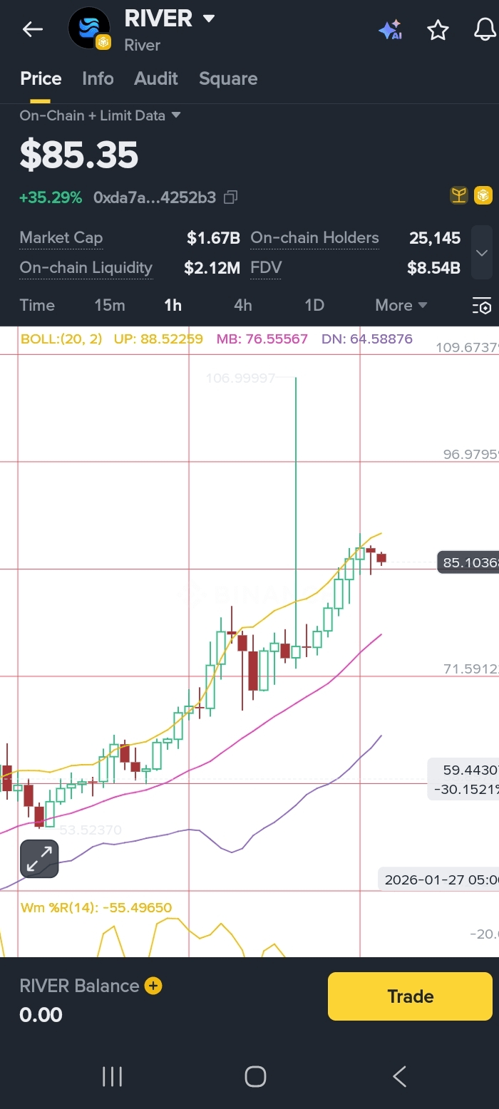 Scenariul bearish (dacă se sparge în jos): Dacă prețul se închide sub $76.56 (BB mijlocie), ar putea semnala epuizare → scădere potențială la zona de suport $64–$71. #River #ALPHA