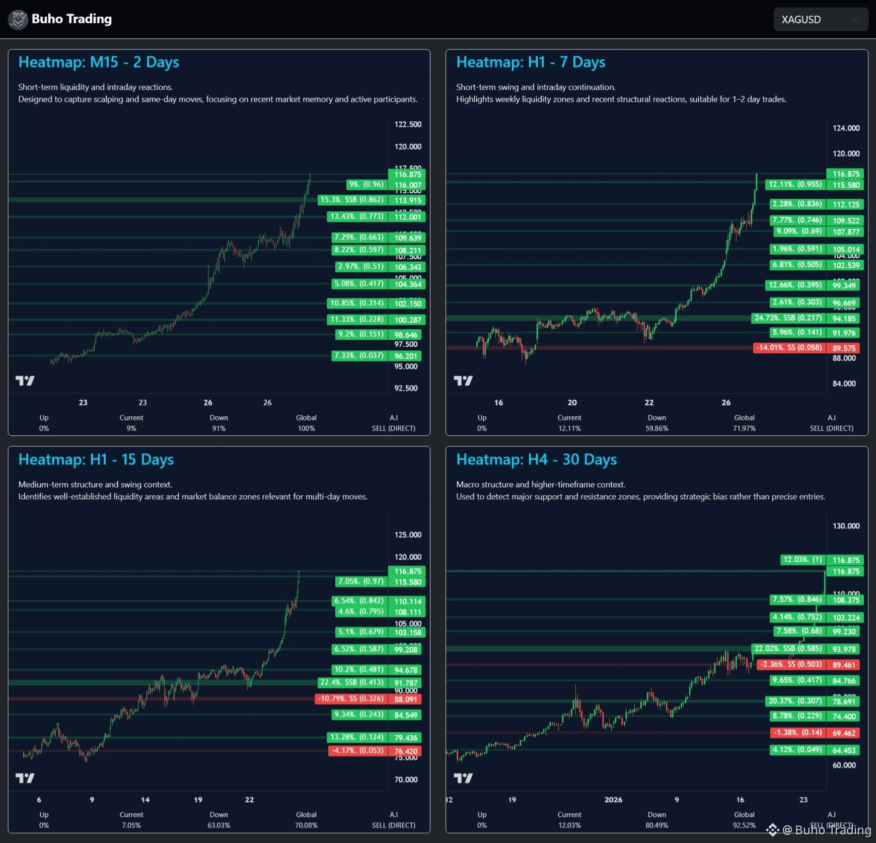La plata mantiene una estructura alcista sólida en marcos mayores, pero el nivel de sobreextensión observado en el corto y mediano plazo sugiere cautela. Será clave observar cómo reacciona el precio ante posibles correcciones antes de evaluar nuevas continuaciones al alza.