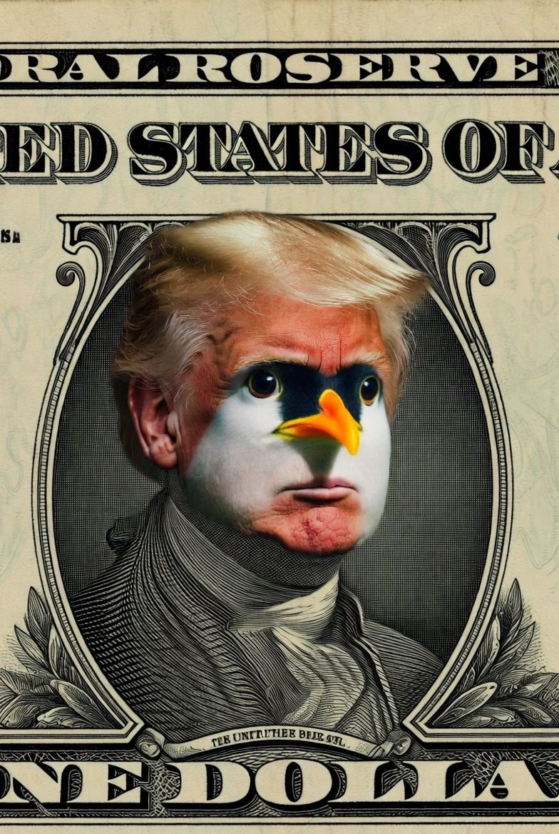 Fraților, priviți cu atenție această imagine: fața lui Trump + ciocul pinguinului + fundalul dolarului = un meme pur și simplu de nivel nuclear!