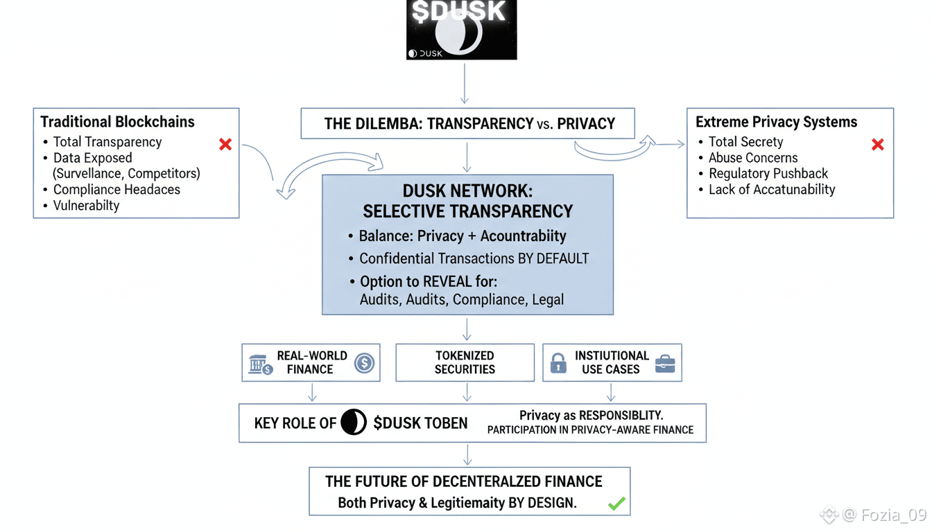 Most blockchains default to total transparency.Every transaction,every balance,every move out in the open forever. That’s great for trustlessness,sure,but it also leaves financial data exposed.Users and institutions end up vulnerable,whether it’s to surveillance,business competitors,or compliance headaches.On the flip side, some systems double down on privacy and lock everything away.But that brings its own problems:concerns about abuse,regulatory pushback,and a lack of accountability.Dusk sees the flaws in both extremes.If you want real adoption in finance,neither approach holds up.