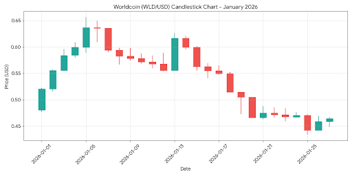 Acțiunea Prețului: WLD a început ianuarie 2026 cu un impuls optimist, atingând un maxim lunar de aproximativ 0,65 $ pe 5 ianuarie. Cu toate acestea, a intrat într-o tendință descendentă susținută ulterior, atingând un minim local de 0,43 $ pe 25 ianuarie. În prezent, se consolidează în jurul valorii de 0,46 $.
