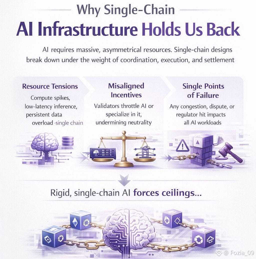 AI infrastructure exposes a flaw that blockchains have managed to sidestep for years:when you cram execution, coordination,and settlement into the same place,scale breaks down fast and it doesn’t fail gently.Most single chain AI designs borrow from DeFi-era blueprints,back when computation was cheap,state transitions were predictable,and a single fee market could smooth out the bumps.AI doesn’t play by those rules.It shatters all three assumptions.