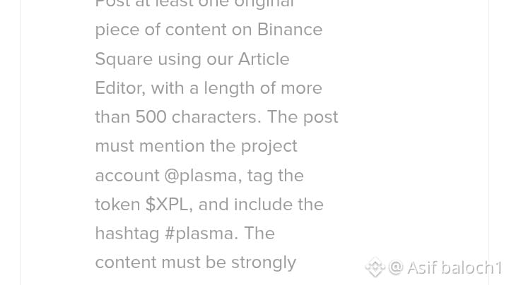 Publica cel puțin o piesă originală de conținut pe Binance Square folosind Editorul nostru de Articole, cu o lungime de peste 500 de caractere. Postarea trebuie să menționeze contul proiectului @Plasma , să eticheteze tokenul $XPL și să includă hashtag-ul #Plasma . Conținutul trebuie să fie strâns legat de Plasma și trebuie să fie original, nu copiat sau duplicat. Această sarcină este în desfășurare până la sfârșitul campaniei și nu va fi marcată ca finalizată.