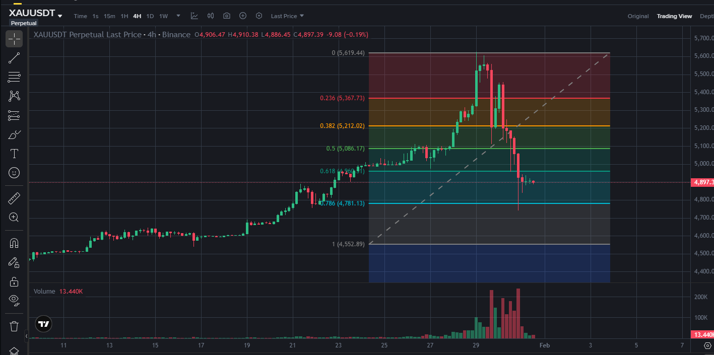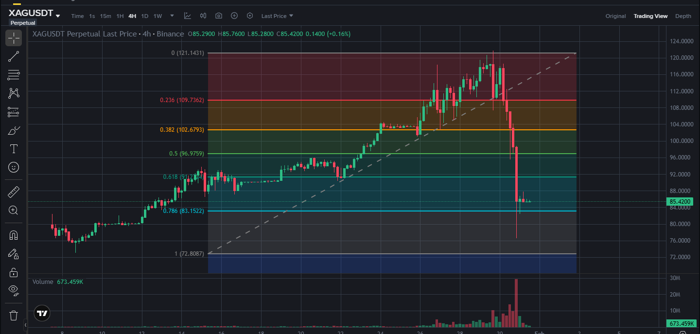 Argintul $XAU tocmai a căzut de la peste 121$ la aproximativ 76$. Aurul $XAU a scăzut sub 5000$. Aceasta este o scădere istorică, cu argintul scăzând cu mai mult de 47% în doar două zile. Toată lumea se întreabă dacă acesta este vârful și dacă ar trebui să ia profit sau chiar să vândă la termen.