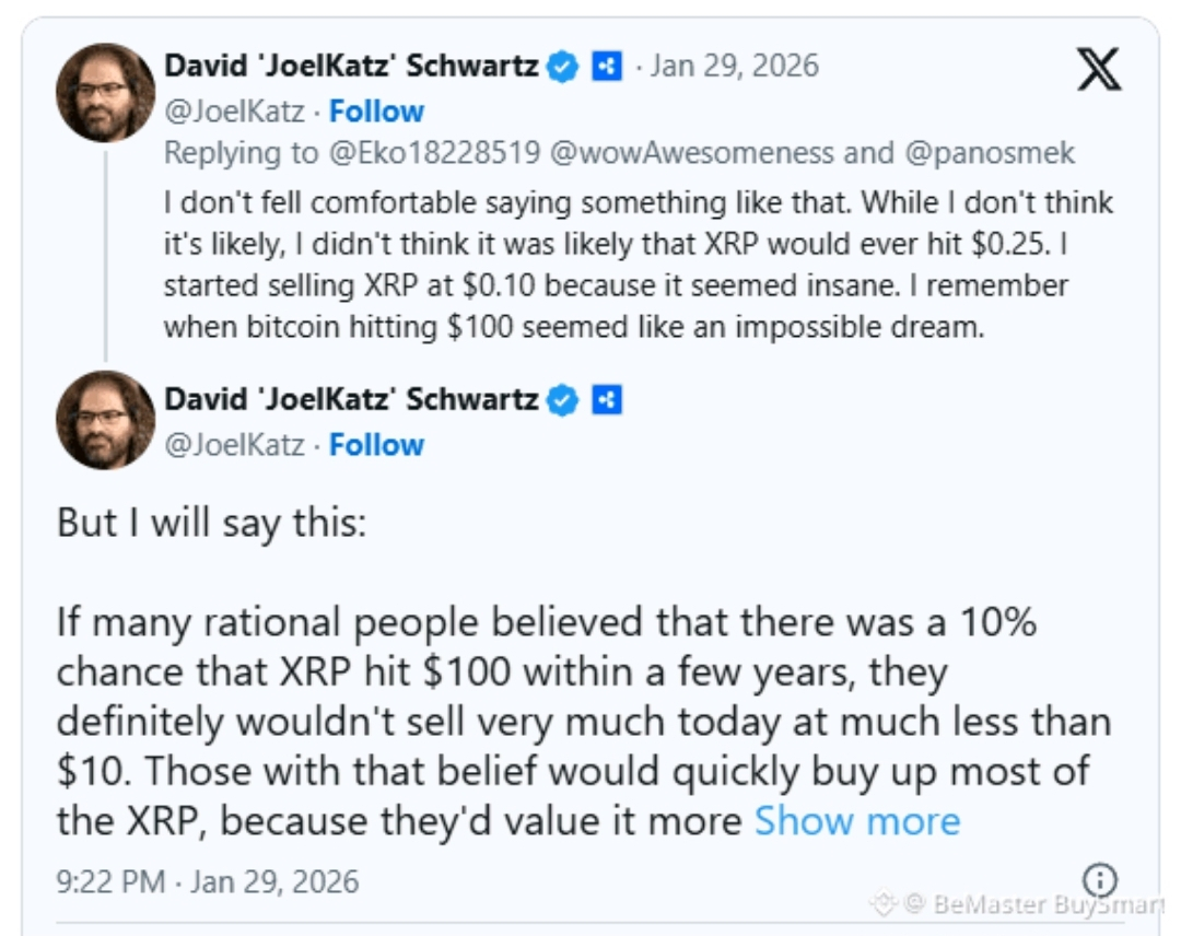 Schwartz a atras atenția asupra trecutului, când a crezut că XRP nu va atinge niciodată 0,25 $, recunoscând că a început să vândă deținerile sale în jur de 0,10 $ pentru că prețurile păreau deja nerezonabile. De asemenea, a subliniat primele zile ale Bitcoin, amintind participanților că mulți oameni au văzut odată un Bitcoin de 100 $ ca pe un obiectiv imposibil.