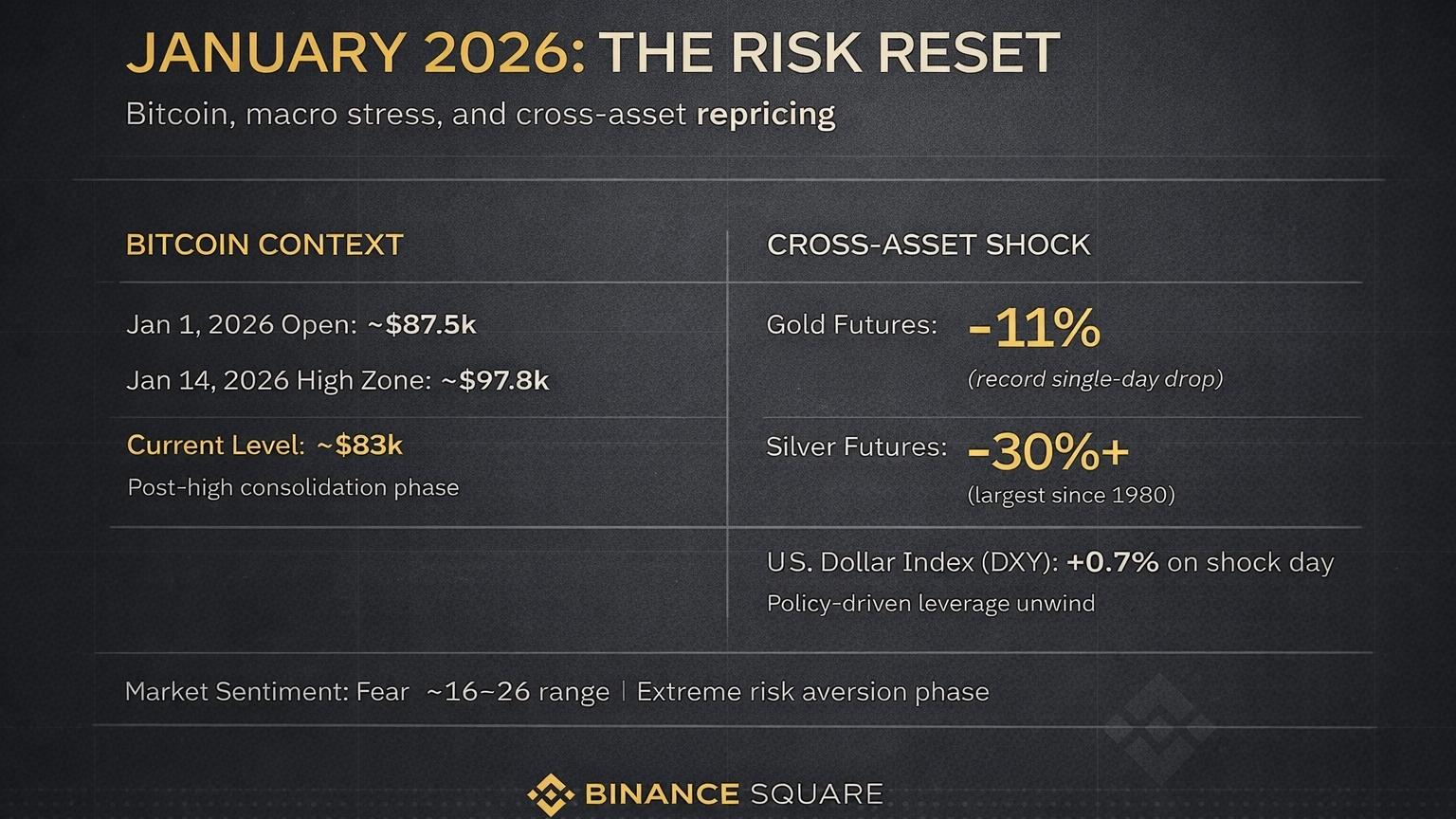 Ianuarie 2026 a avut catalizatori reali. Bitcoin nu s-a transformat niciodată doar într-o poveste. A răspuns la șocul politic și la lichiditate și la resetarea rapidă a așteptărilor macroeconomice în diverse clase de active.