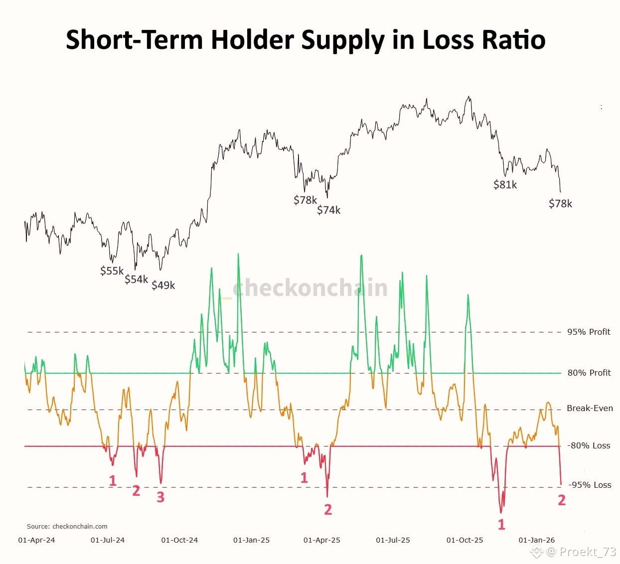 Что бросается в глаза - в 2024 и 2025 эти волны с каждым разом были все более болезненными. А текущее снижение отличается. Падение к 78 000$ - пока не такое болезненное по доле убыточных краткосрочных держателей, как падение к 81 000$. Значит либо в этот раз ситуация будет развиваться по-другому, либо еще не допадали.