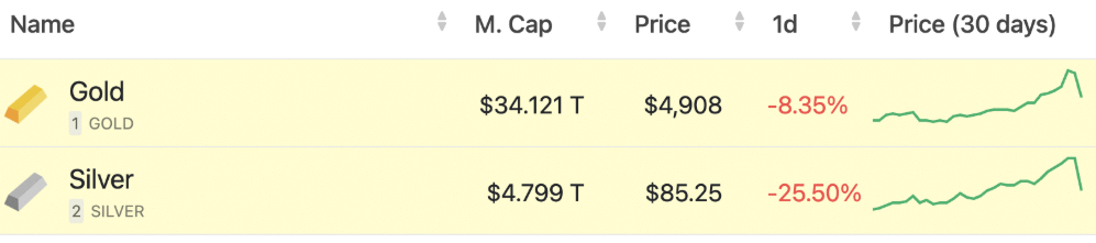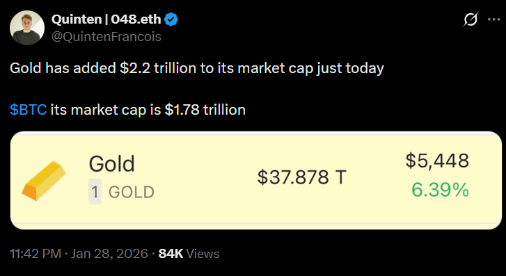 Conform postărilor de pe X de către comentatorii de piață, capitalizarea aurului a crescut cu aproximativ 2,2 trilioane de dolari 💰 într-o singură sesiune de tranzacționare. Această mișcare a dus metalul la o evaluare atrăgătoare care eclipsează multe active cripto.