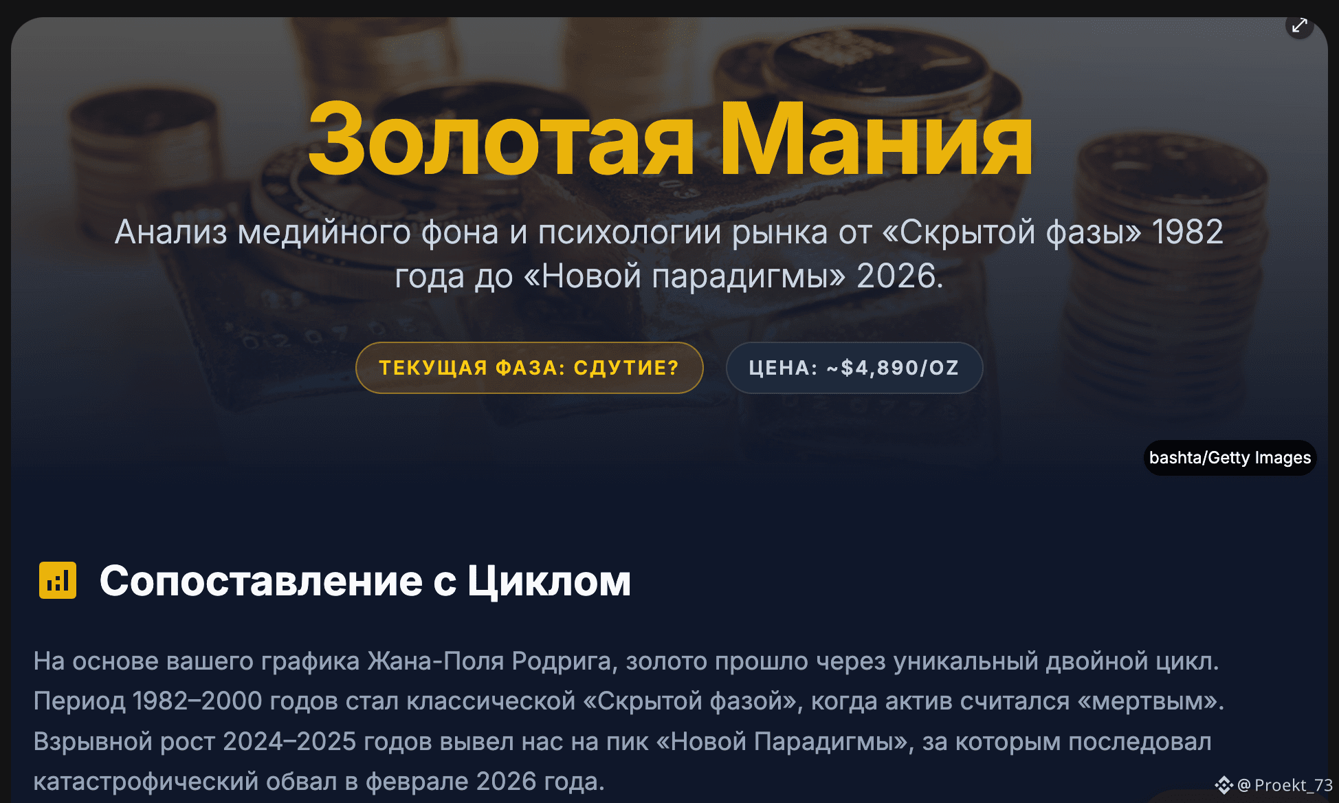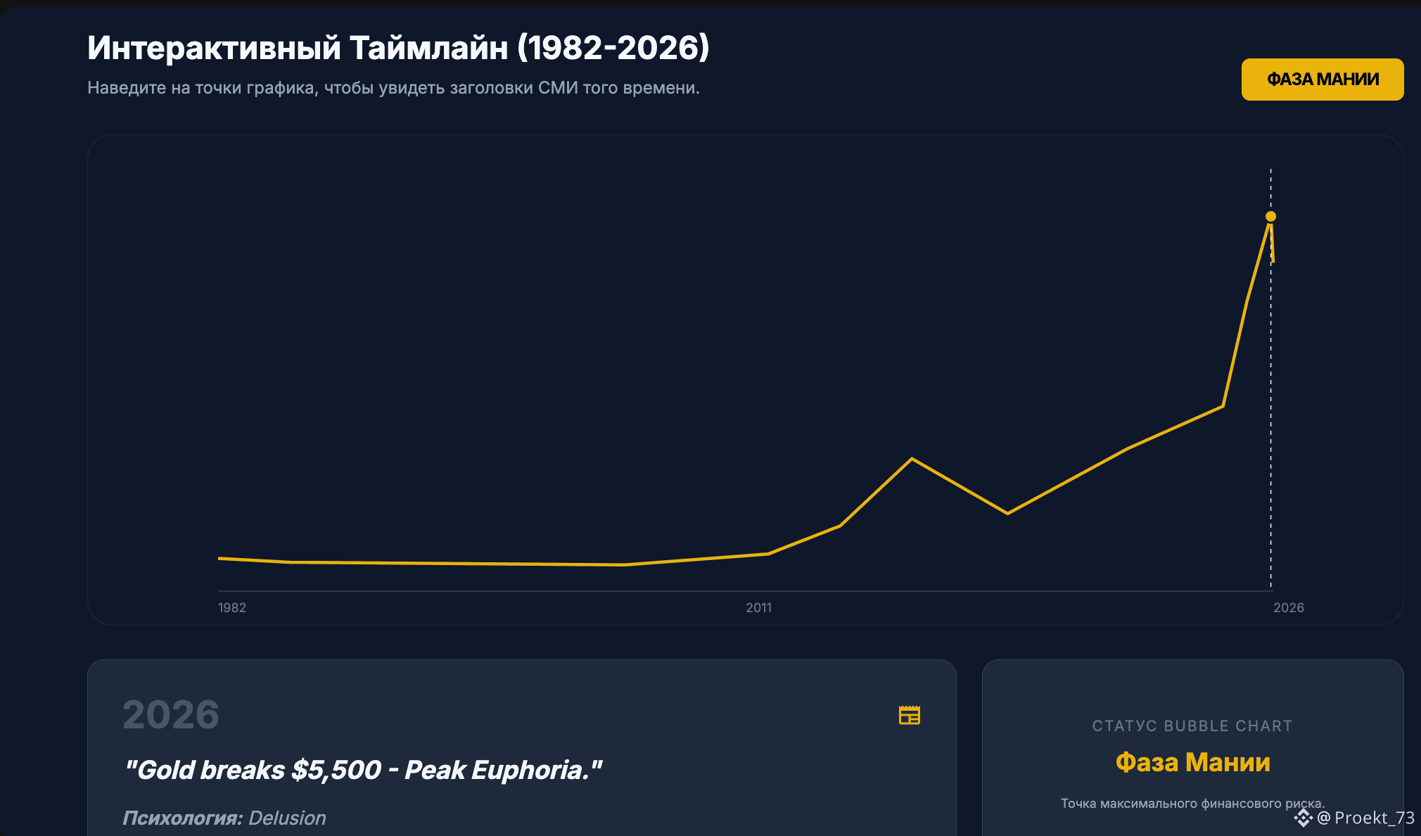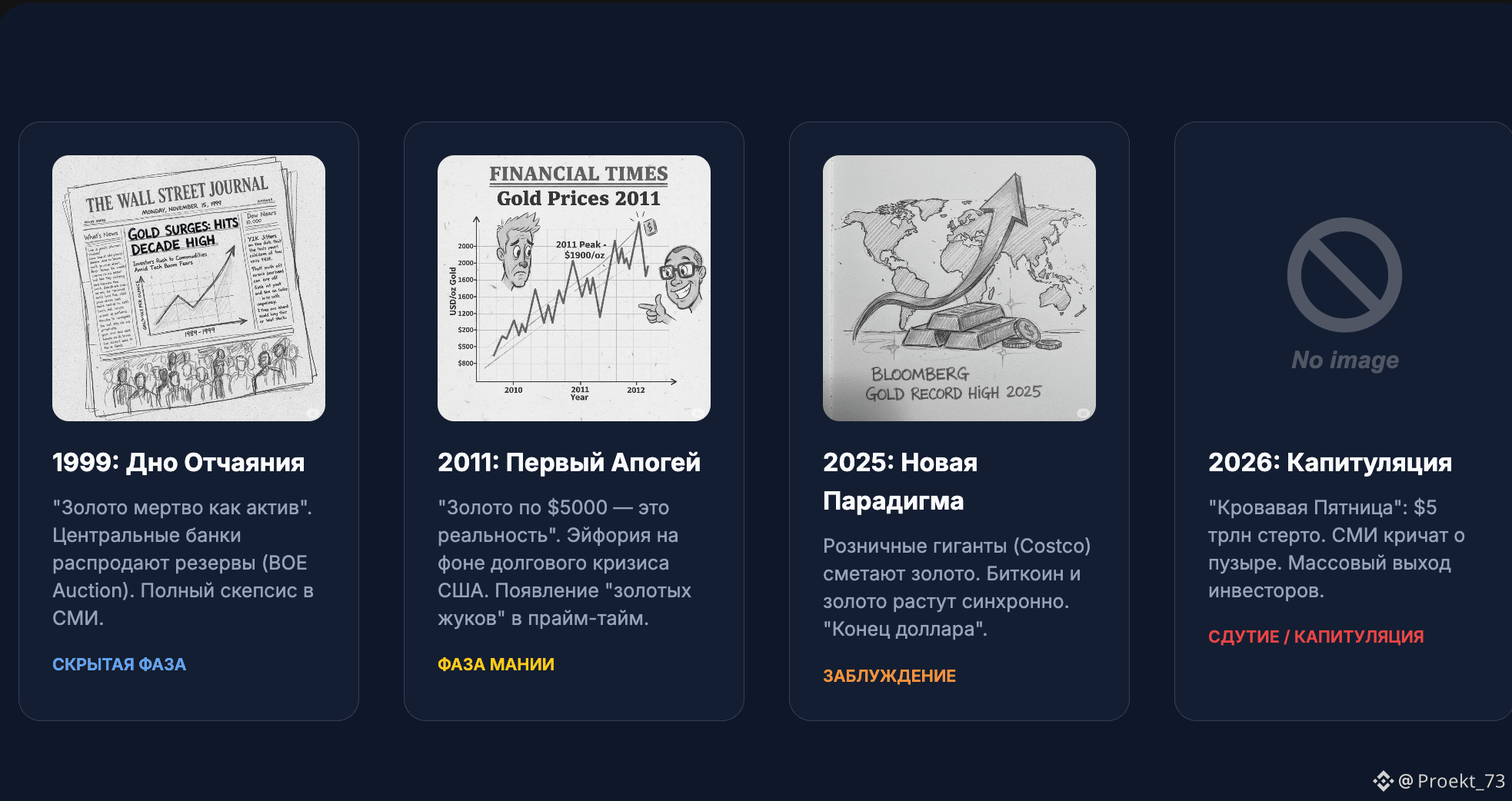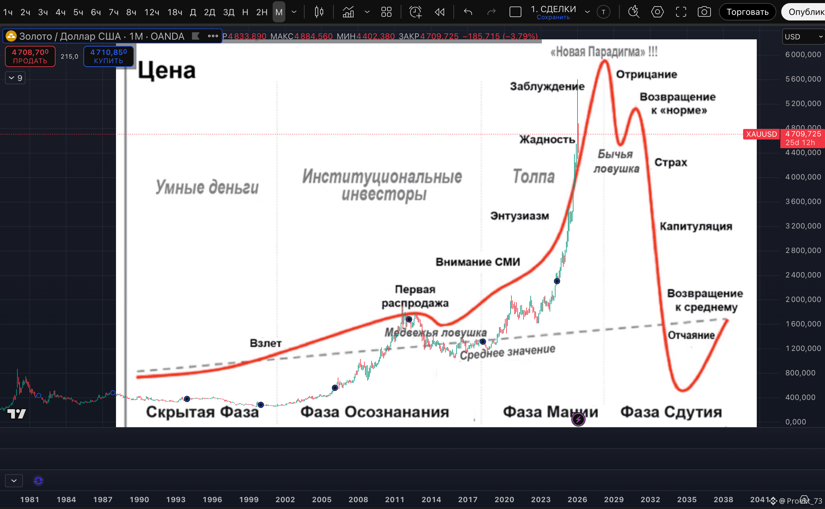Кстати, вчера "скормили" Gemini от Google схему психологического цикла рынка и попросили проанализировать заголовки СМИ по цене золота с 1982 года по 2026, соотнести годы со схемой. Без подталкивания к каким-либо выводам. Получилось примерно то же, о чем писали на основе своих соображений - мы в "Фазе Мании" и она может быть близка к завершению. В оценке Gemini "Фаза Сдутия" уже стартовала.