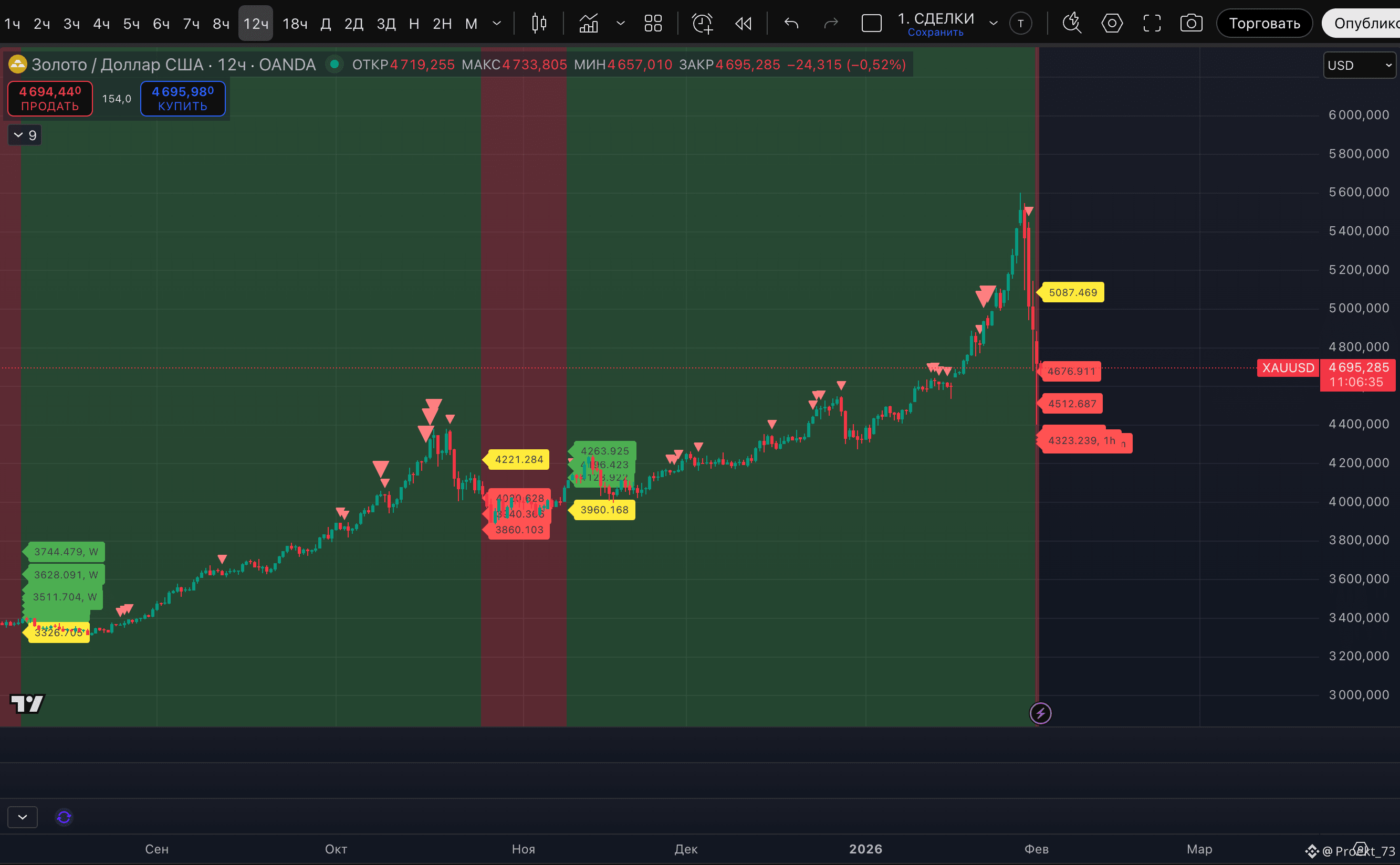 Золото показало ожидаемый сигнал - переход в устойчивый даунтренд на 12-часовом ТФ. Впервые с 10 ноября прошлого года. При этом сегодня цена спускалась уже до 4 402$. Достигнув заранее частично собрав базовые цели даунтренда. Но индикатор выставляет базовые цели снова, это 4 512$, 4 348$. Уровень потенциального слома - 5 087$.