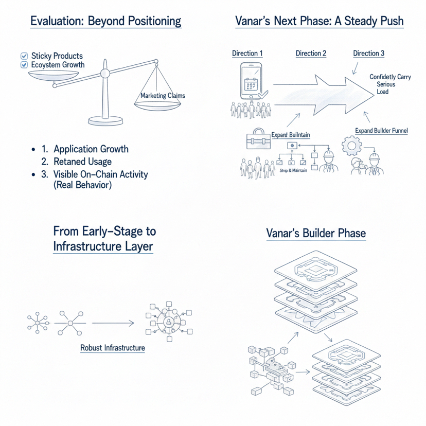Când oamenii mă întreabă ce cred că este „următorul”, nu fac predicții mari, pentru că ceea ce mă aștept este o împingere constantă în trei direcții care urmează în mod natural din cadrul lui Vanar, unde prima direcție este dovedirea tezei consumatorului prin aplicații care pot susține utilizarea zilnică, a doua direcție este extinderea canalului de constructori astfel încât echipele să simtă că este mai ușor să livreze și să mențină produse în cadrul ecosistemului, iar a treia direcție este maturizarea mecanicilor de participare în timp, astfel încât rețeaua să arate mai puțin ca un sistem în stadiu incipient și mai mult ca un strat de infrastructură care poate susține cu încredere o sarcină serioasă.