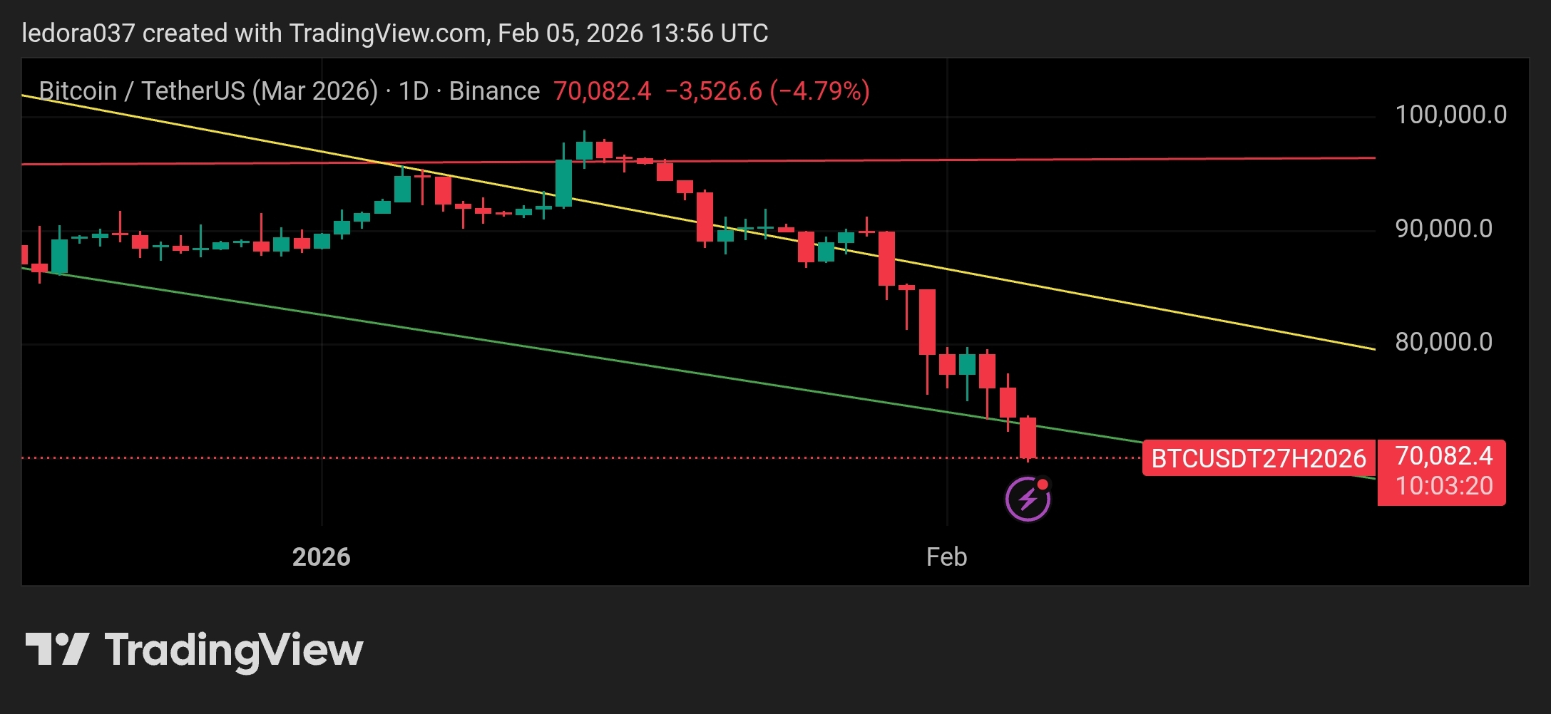 Graficul arată o tendință descendentă clară cu noi scăderi ale suportului, închizându-se aproape de $70,000 și probabil continuând să scadă. Lumânările roșii și liniile de tendință descrescătoare indică faptul că presiunea bearish este dominantă în acest moment.