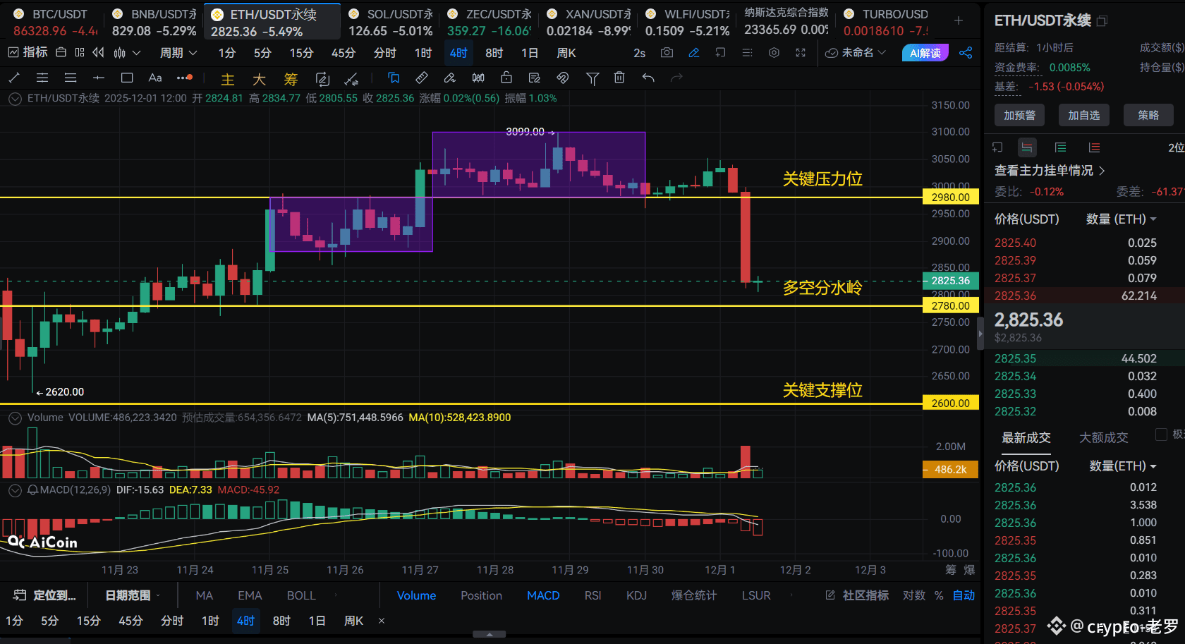 2. 资金面与技术面共振。宏观利空打压市场情绪,而ETH价格接连跌破3000和2900美元两道重要心理关口,触发了大量技术性卖盘和止损盘。这种下跌具有自我强化的动能。
