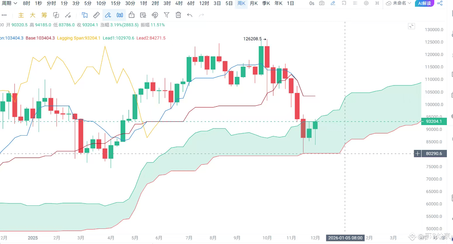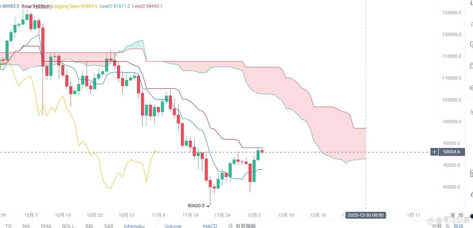 · 周线级别:前期的暴跌在80600美元附近(云层底部)获得强力支撑后反弹,说明长期上升结构的根基未毁。