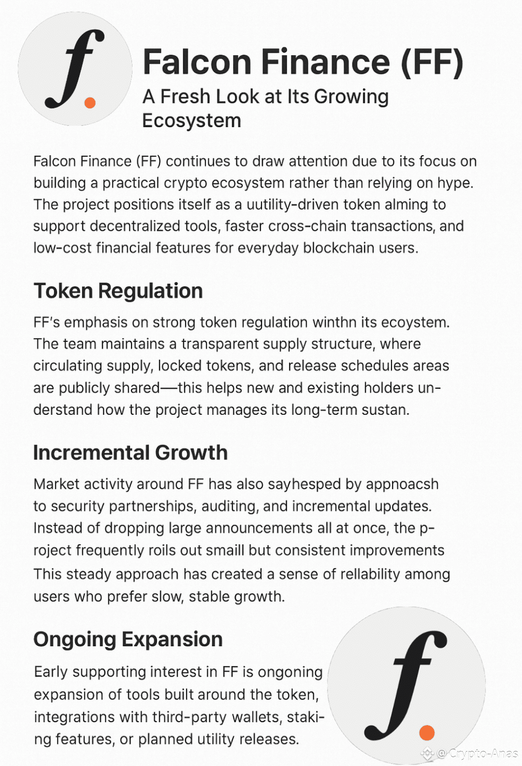 Falcon Finance (FF) continues to draw attention due to its focus on building a practical crypto ecosystem rather than relying on hype. The project positions itself as a utility-driven token aiming to support decentralized tools, faster cross-chain transactions, and low-cost financial features for everyday blockchain users.