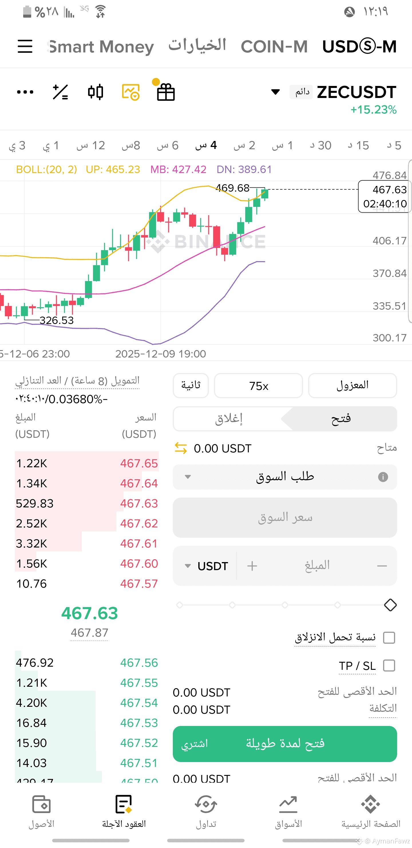 الملاحظة: السعر الحالي (476.84) يتداول بشكل ملحوظ فوق الحد الأعلى للبولينجر باند. هذا يشير إلى أن الأصل في حالة شراء مفرط (Overbought) على هذا الإطار الزمني وقد يكون معرضا لجني أرباح أو تصحيح سعري قصير المدى ليعود ويلامس المتوسط أو الحد الأعلى.