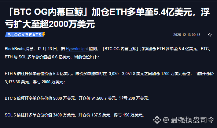 炸穿币圈!12 月 13 日 “BTC OG 内幕巨鲸” 疯了?豪掷 5.4 亿美金加仓 ETH 多单,开仓价 3173 美金,现在浮亏超 2000 万仍不慌!