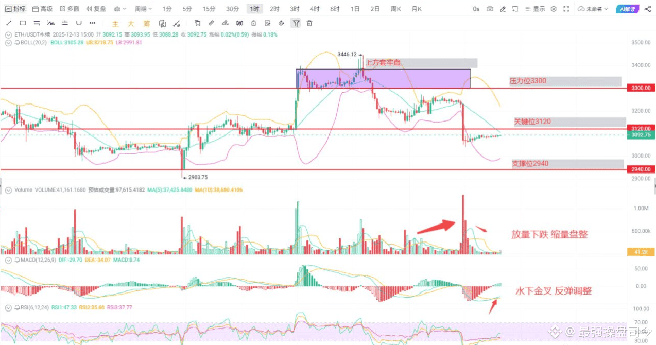 技术面偏空但短线藏反弹,巨鲸 5.4 亿加仓释放乐观信号,可人家还浮亏 2000 万呢~ 大概率在 2940-3120 区间震荡,突破 3120 就打开 3300 冲击通道,跌破 2940 下探风险直接拉满!