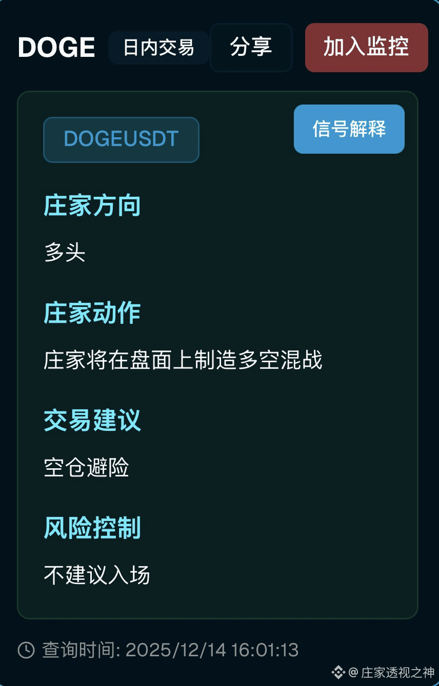 从监控信号来看,核心就一句话:庄家方向偏多,但盘面会被刻意做成“多空混战”,因此更像是“震荡洗盘+诱多诱空”的结构,而不是顺畅单边。这类盘面最容易出现:上一秒看突破,下一秒就插针回落;你以为要回调,结果又反手拉回去,专门收割追涨杀跌的情绪盘,所以系统才会给到“空仓避险 / 不建议入场”。