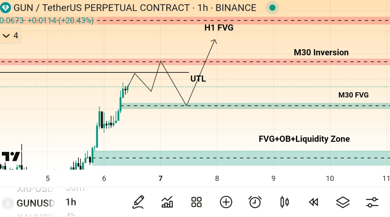 GUN может немного протестировать уровень UTL на 2-5%, и если цена пробьет его, она пойдет прямо к его инверсии M30, так что мы можем взять короткую позицию с уровня $0.0760, но без подтверждения я не рекомендую торговать, я всегда следую подтверждению VSA. Итак, от инверсии цена упадет до M30 FVG или зоны ликвидности, так что мы купим GUN на долгий срок, то есть купим на споте. И цена будет бычьей, потому что они нарушают все свои BOS.