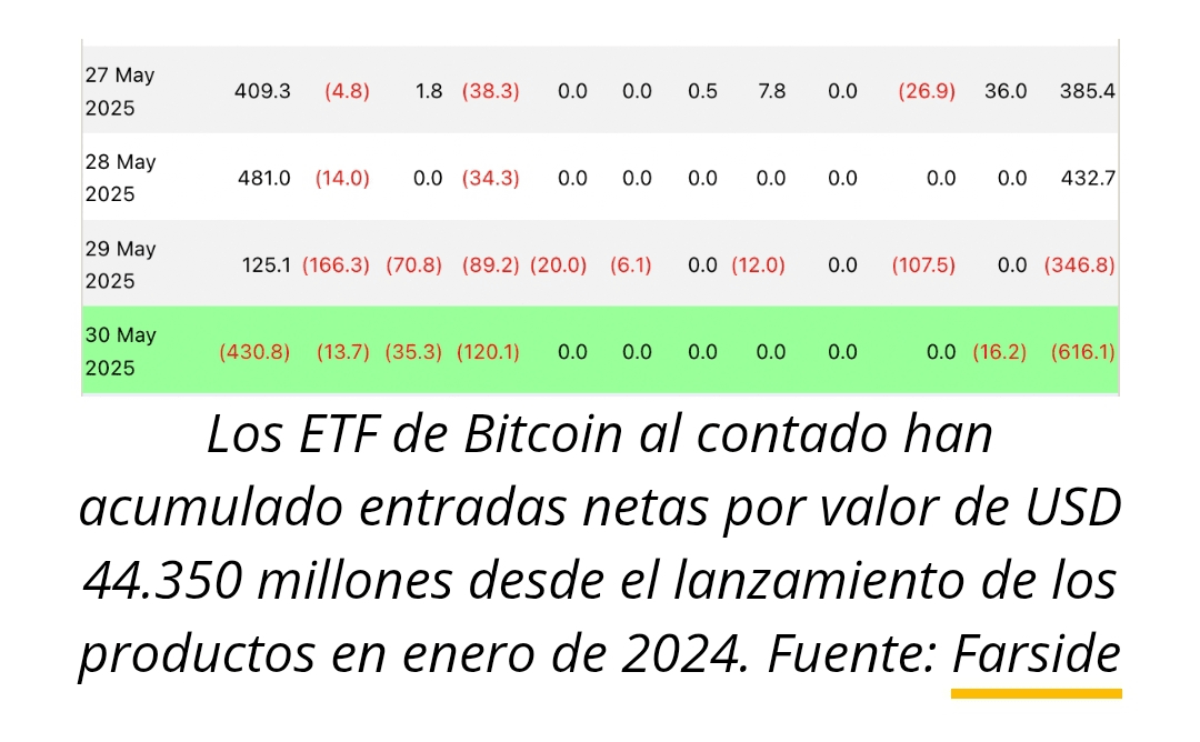 В целом 11 ETF на спотовом рынке биткойнов в США зафиксировали чистые выходы второй день подряд 30 мая на сумму 616,1 миллионов долларов США.