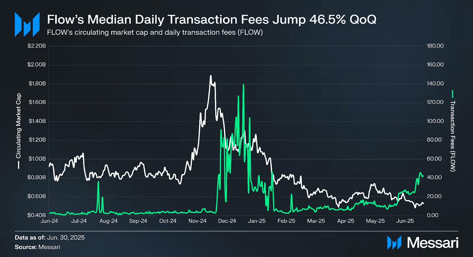 Так вот, здесь и возникает странность. Зеленая линия на графике показывает ежедневные транзакционные расходы сети FLOW. Эти расходы отражают, насколько активно пользователи совершают транзакции и используют сеть. К сожалению, несмотря на рост рыночной капитализации, транзакционные расходы FLOW резко упали, даже снизившись на 46,5% по сравнению с предыдущим кварталом (QoQ)! 😨