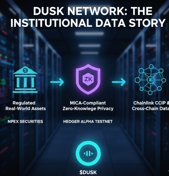 Этот рефлексивный текст укрепляет меня: ДНК Dusk встраивает соблюдение в конфиденциальность—доказуемая zk для институциональной верификации, без возможности отказа, который рискует раскрытием. Партнерство с NPEX предоставляет лицензированную инфраструктуру нидерландской MTF, токенизируя более €300м в реальных ценных бумагах на блокчейне. Chainlink CCIP обеспечивает безопасную межцепочную совместимость для данных и активов, Quantoz EURQ обеспечивает стабильность евро в соответствии с MiCA для расчетов. $DUSK является основой утилиты: стекинг обеспечивает консенсус, а гиперстеккинг приносит доход, расчеты очищают сделки DuskEVM, голосование по управлению уточняет параметры протокола. Недавнее развертывание Hedger строится на интеграциях NPEX/21X—профессиональный прогресс к регулируемой целостности данных.