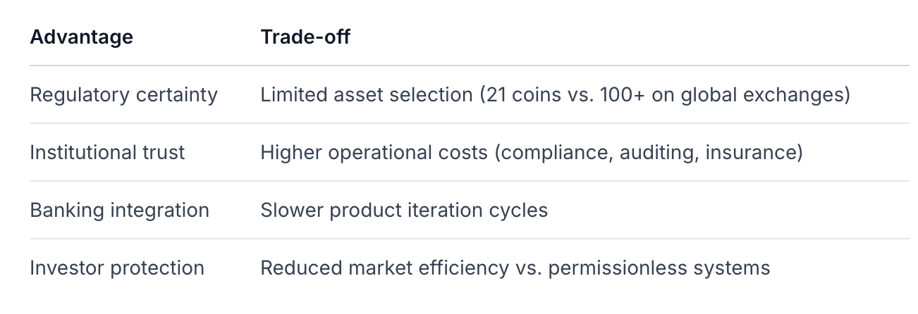 Влияние на эффективность капитала: хотя модель HashKey снижает риск контрагента и регуляторную неопределенность, она неизбежно жертвует некоторой эффективностью капитала по сравнению с оффшорными биржами за счет более высоких затрат на соблюдение норм и более узкого выбора активов.