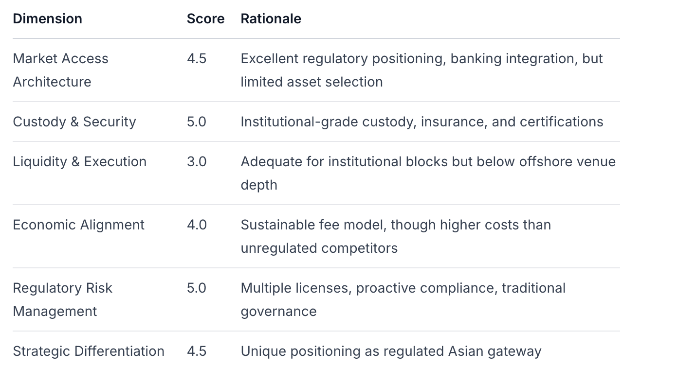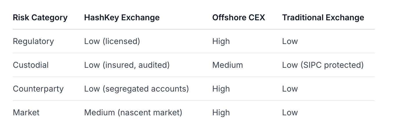 Вердикт: риск-профиль HashKey наиболее близок к традиционным регулируемым биржам, а не к крипто-родным платформам, с значительно сниженными регуляторными и контрагентскими рисками, компенсированными рисками рыночного принятия.