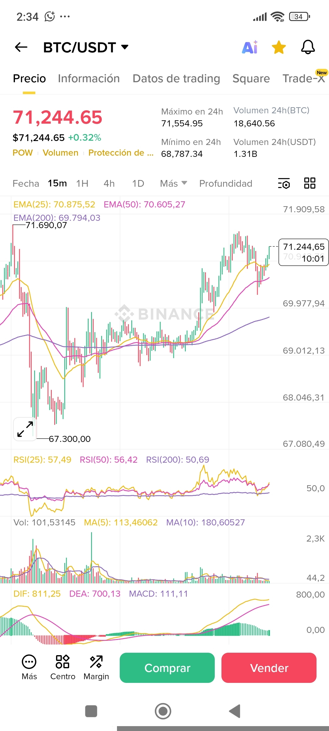 • Tendencia: Claramente alcista en el corto plazo. El precio está "cabalgando" la EMA 25 (línea amarilla), lo que indica un momentum increíble.