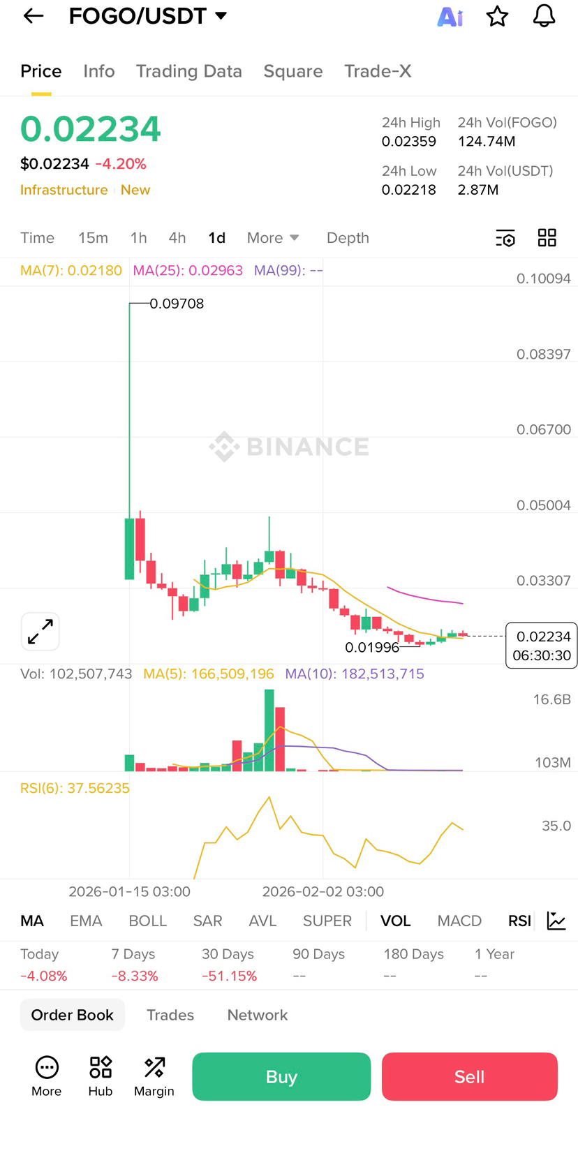 Если вы внимательно посмотрите на график, после этого безумного всплеска до около 0.09708 цена никогда не восстанавливалась сильно. Этот всплеск был как хайповая свеча, большая зеленая, но после этого продавцы вошли очень агрессивно. С тех пор, как достигли вершины, FOGO делает нижние максимумы и нижние минимумы. Это явное поведение медвежьего тренда.