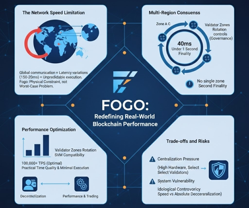 Fogo addresses what it calls the "network speed limitation." In a global network, due to the physical limitations of fiber optic cables, data transmitted across continents inevitably faces latency of 150 to 200 milliseconds. Traditional blockchains treat this as a coordination problem, while Fogo treats it as a physical constraint.