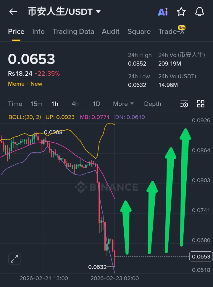 $币安人生 has dropped more than 20% after rejecting the 0.090–0.092 resistance zone and collapsing toward 0.0632. On the 1H timeframe, price was already weakening below the mid Bollinger Band, signaling loss of bullish momentum before the sharp breakdown. Once the 0.080 support failed, selling pressure accelerated rapidly, triggering stop-loss cascades and panic-driven exits. As a newly listed meme token, volatility is naturally high, and liquidity gaps can amplify downside moves.
