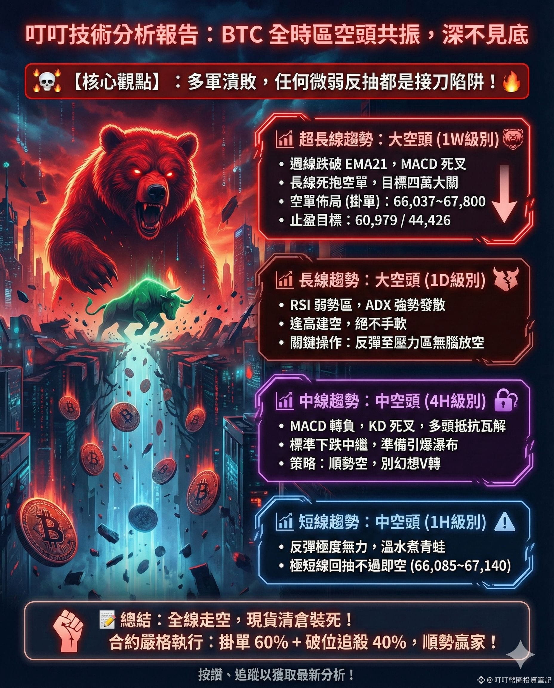 【核心觀點】:全時區空頭共振,多軍潰敗深不見底,任何微弱反抽都是接刀陷阱。