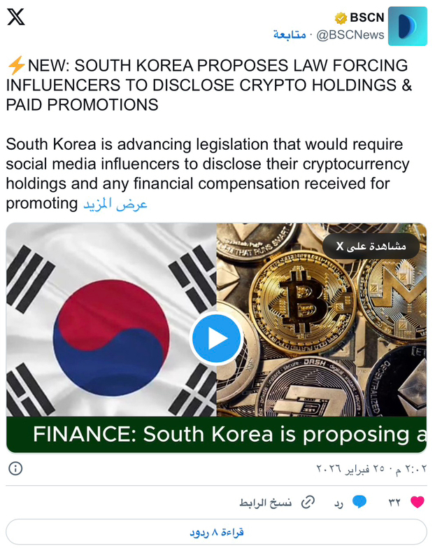 تكثّف كوريا الجنوبية رقابتها على الترويج للعملات الرقمية عبر وسائل التواصل الاجتماعي. ففي 25 فبراير، اقترح مشرّعون من الحزب الديمقراطي الحاكم مشروع قانون. يُلزم المؤثرين بالكشف عن حيازاتهم من العملات الرقمية وأي ترويج مدفوع يتلقونه. ويستهدف الإجراء ما يُعرف بـ«المؤثرين الماليين». وهم الذين يقدّمون بانتظام آراء استثمارية عبر الإنترنت.