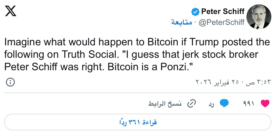 في منشوره، دعا بيتر شيف متابعيه إلى تخيل أن ترامب كتب على Truth Social أن بيتكوين مخطط احتيالي. وألمح إلى أن مثل هذه الرسالة قد تؤدي إلى موجة بيع حادة. وكان شيف قد وصف بيتكوين مرارًا بأنها هشة وأقرب إلى فقاعة. وهذه المرة جدد تمسكه بهذا الموقف.