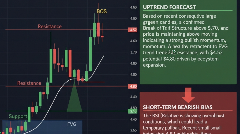 Support & Resistance: Immediate resistance sits at $4.52, with a secondary psychological ceiling at $4.80. Conversely, the $3.40 level has established itself as a rock-solid support zone, bolstered by high-volume trading.