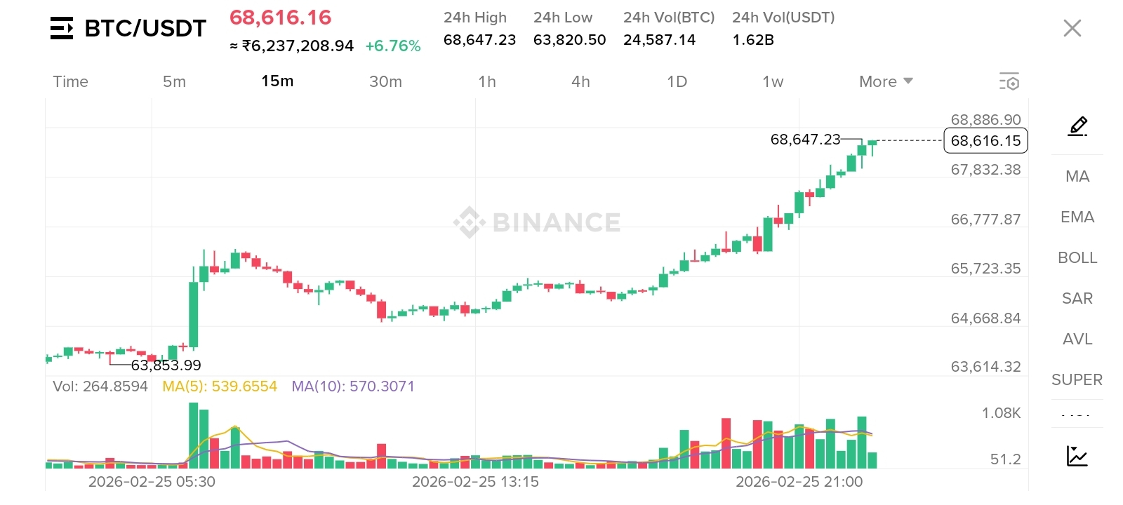 Bitcoin is flashing renewed strength, and traders are paying close attention. The BTC/USDT pair has climbed steadily, recently pushing above the $68,000 level with a strong +6% daily gain. The chart tells a clear story: buyers are stepping in with confidence, and momentum is building.