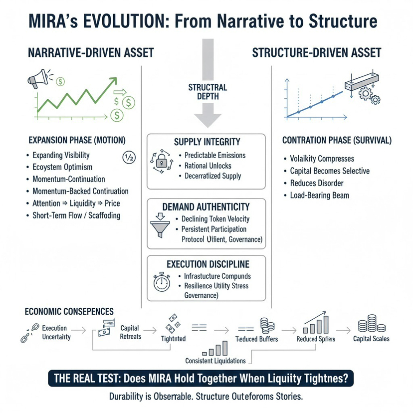 Most traders are asking whether MIRA is the next breakout. I am asking a different question: if liquidity tightens tomorrow, does MIRA still hold together? In crypto, narrative creates motion, but structure determines survival. The market consistently overpays for motion because it is visible and immediate. Structure is slower. It shows up only when volatility compresses and capital becomes selective. That is where separation begins.