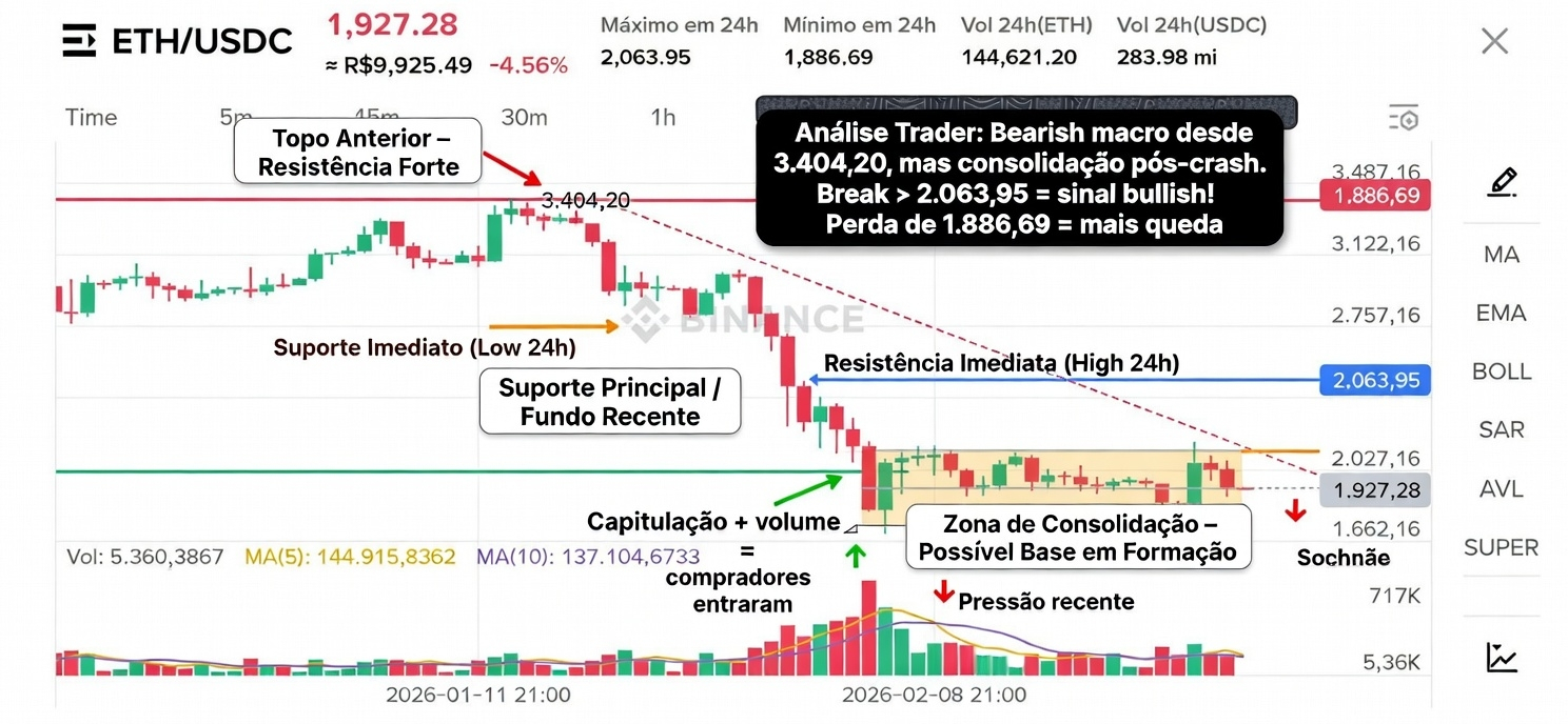 Agora o Ethereum está em 1.927,28 (-4,56% em 24h), dentro de uma consolidação lateral entre 1.880k–2.027k após tocar o suporte forte.