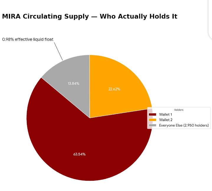 the frame worth running: when 86.16% of float is controlled by two wallets and 76.59% of total supply is still incoming — the price of $MIRA isn't being discovered by a market. it's being managed by a handful of participants who entered earlier and cheaper than anyone buying today. that's a diferent risk category than normal unlock pressure. unlock pressure assumes a distributed holder base absorbing supply. this assumes two wallets deciding when and whether to let price move.