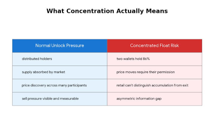 the mechanism here isn't that the two dominant wallets will definitely sell. it's that they don't need to sell for concentration to be a problem. price discovery in a market where 86% of float is controlled by two addresses isn't price discovery — it's permission. every rally requires those wallets to not sell. every dip could be either natural correction or quiet exit. retail participants have no way to distinguish between the two in real time. that asymmetry of information is the real risk, not the unlock schedule itself.