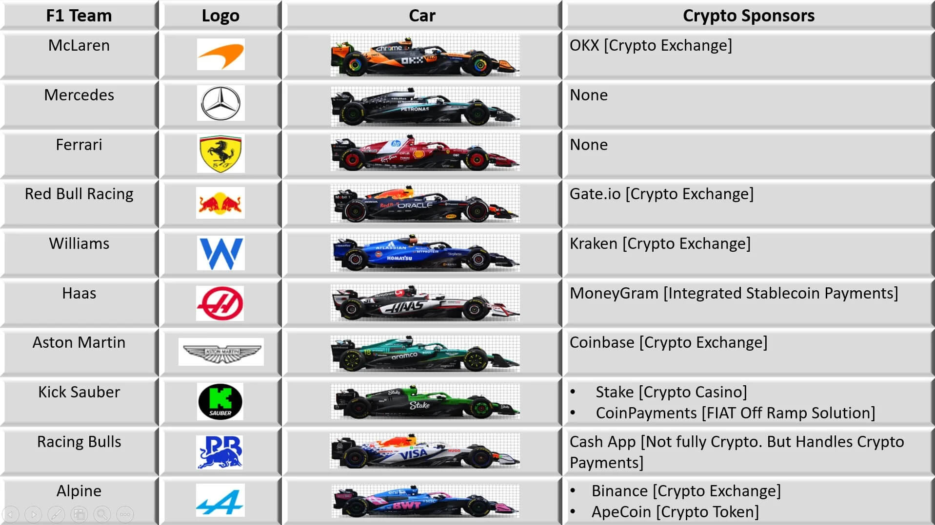 2025年F1车队与加密赞助商(来源:reddit)