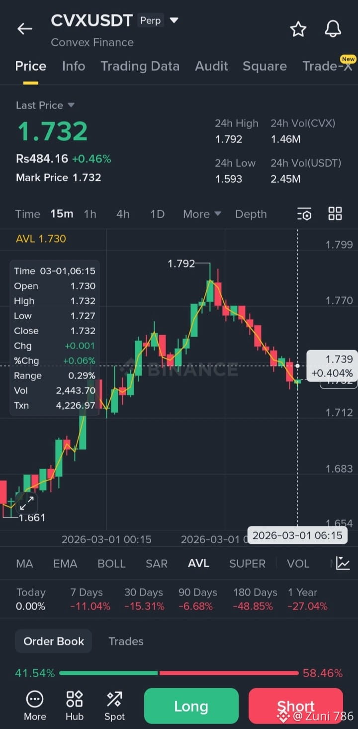 The chart shows Convex Finance ($CVX ) finding local support after a recent pullback from the 24h high of 1.792. We are seeing a slight consolidation near the 1.730 level. If the price holds above the current support, we could see a bounce back toward the recent peak.