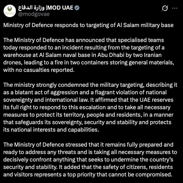 - Прошел удар беспилотника по-французской военной базе в Абу-Даби и удар иранских беспилотников по нефтяной вышке ОАЭ в Персидском заливе. Минобороны ОАЭ предупредили о возможном ответе на агрессию со стороны Ирана.