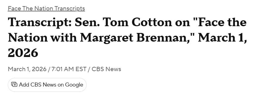 - Трамп не планирует сухопутные операции в Иране, об этом заявил телеканалу CBS News Том Коттон. Республиканец, возглавляющий комитет Сената по разведке.