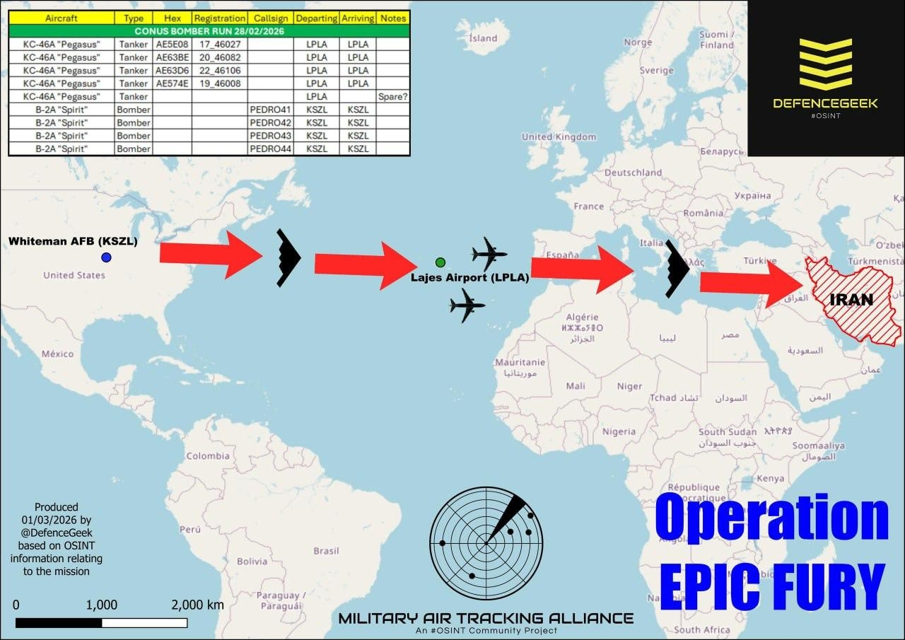- Осинт-аналитики сообщают, что четыре бомбардировщика B-2 совершили полет из США туда и обратно и сбросили десятки бомб весом 2000 фунтов на подземные объекты баллистических ракет в Иране.